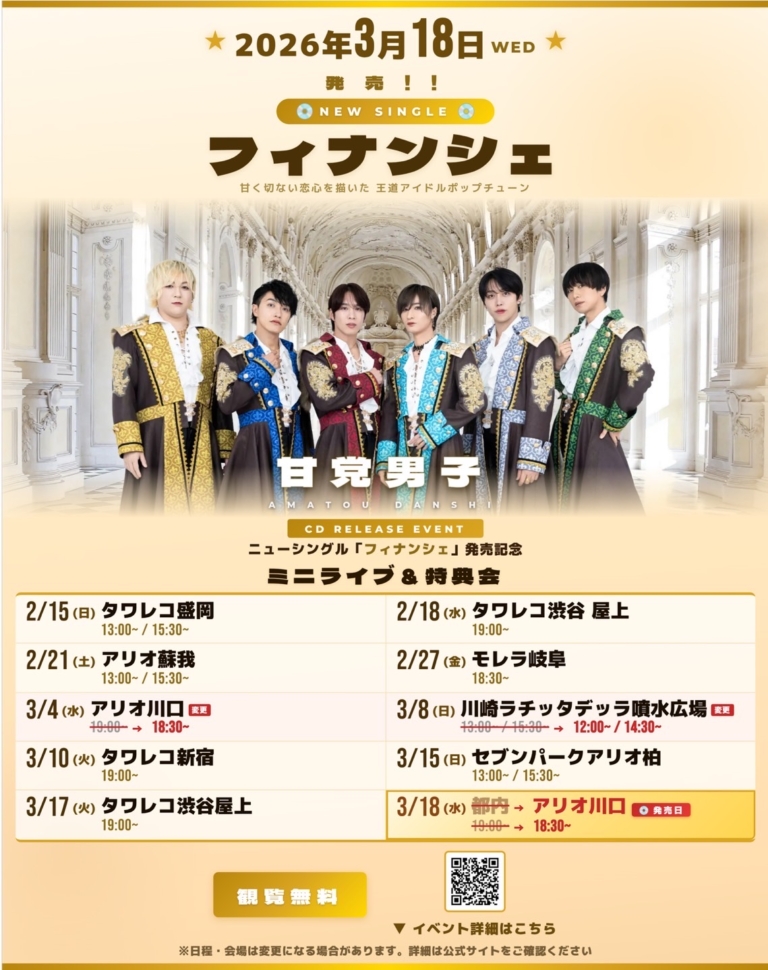 ※(野外会場の場合)雨天時は危険防止のため、傘の使用を禁止いたします。カッパ、ウインドブレーカーなどの雨具をご用意下さい。また天候の都合により、ミニライブが中止の場合もございます。ミニライブ中止の場合は、特典会のみ実施の場合もございます。変更があった際は公式Xでご案内させていただきます。